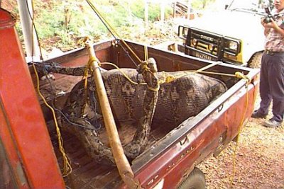 chargent le reptile à l'arrière de leur